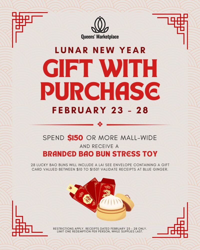 Spend $150 or more mall-wide at Queens’ Marketplace and receive a free bao bun stress toy!* Plus, 28 bao buns will include a lucky lai see containing a merchant gift card worth up to $150. Validate receipts at Blue Ginger (next to CROCS) during store hours. Limit one redemption per person, while supplies last. *Restrictions…